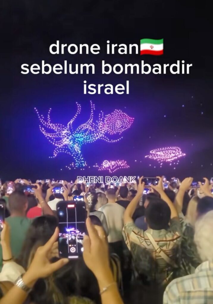 Tidak ditemukan bukti bahwa objek cahaya di langit tersebut merupakan rudal yang berkaitan dengan konflik Iran – Israel. Pola yang terbentuk rapi dan terkoordinasi lebih menyerupai pertunjukan drone (drone light show), ditambah dengan situasi warga yang terlihat berkumpul sambil merekam kejadian di ruang terbuka.