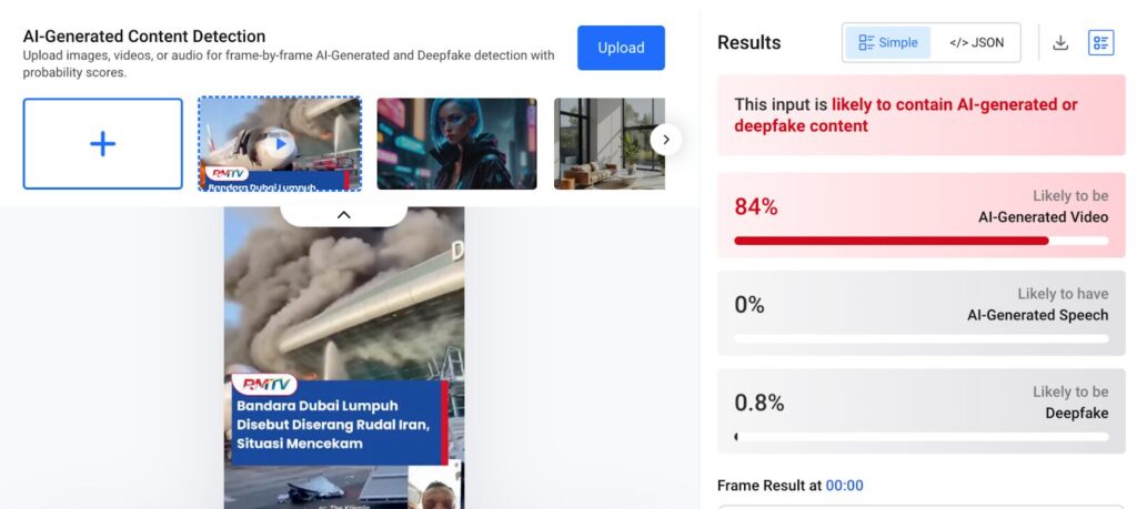 Pengujian tambahan menggunakan alat pendeteksi konten berbasis kecerdasan buatan juga menunjukkan tingkat keyakinan yang sangat tinggi bahwa video tersebut merupakan hasil rekayasa akal imitasi (AI), sehingga tidak mencerminkan peristiwa yang benar-benar terjadi.