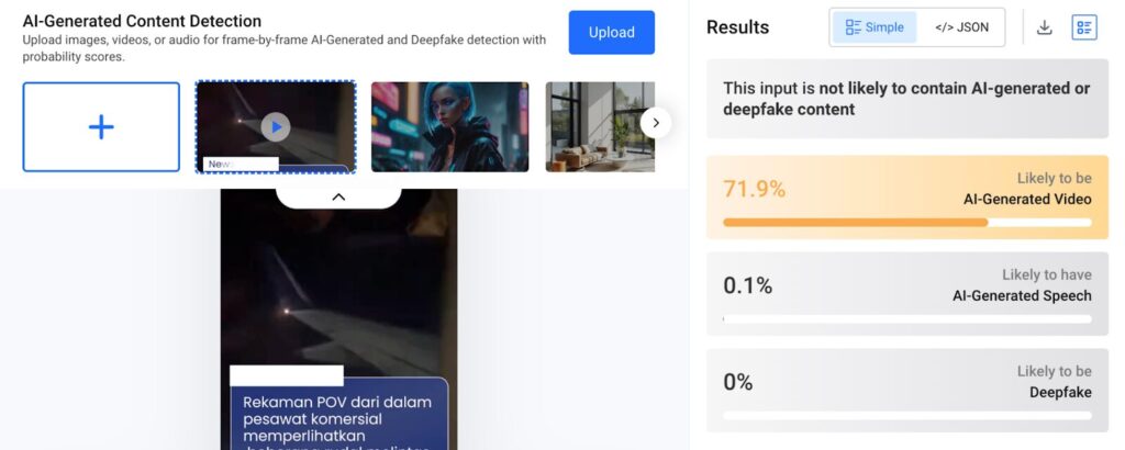 Selain itu, Tim Pemeriksa Fakta Cyberity juga melakukan analisis menggunakan alat pendeteksi konten berbasis kecerdasan buatan, Hive Moderation. Hasil analisis menunjukkan adanya indikasi bahwa video tersebut kemungkinan merupakan hasil rekayasa kecerdasan buatan (AI) dengan probabilitas mencapai 71,9 persen. Temuan ini menunjukkan bahwa visual yang tampak seperti rudal melintas di luar jendela pesawat berpotensi merupakan manipulasi digital.