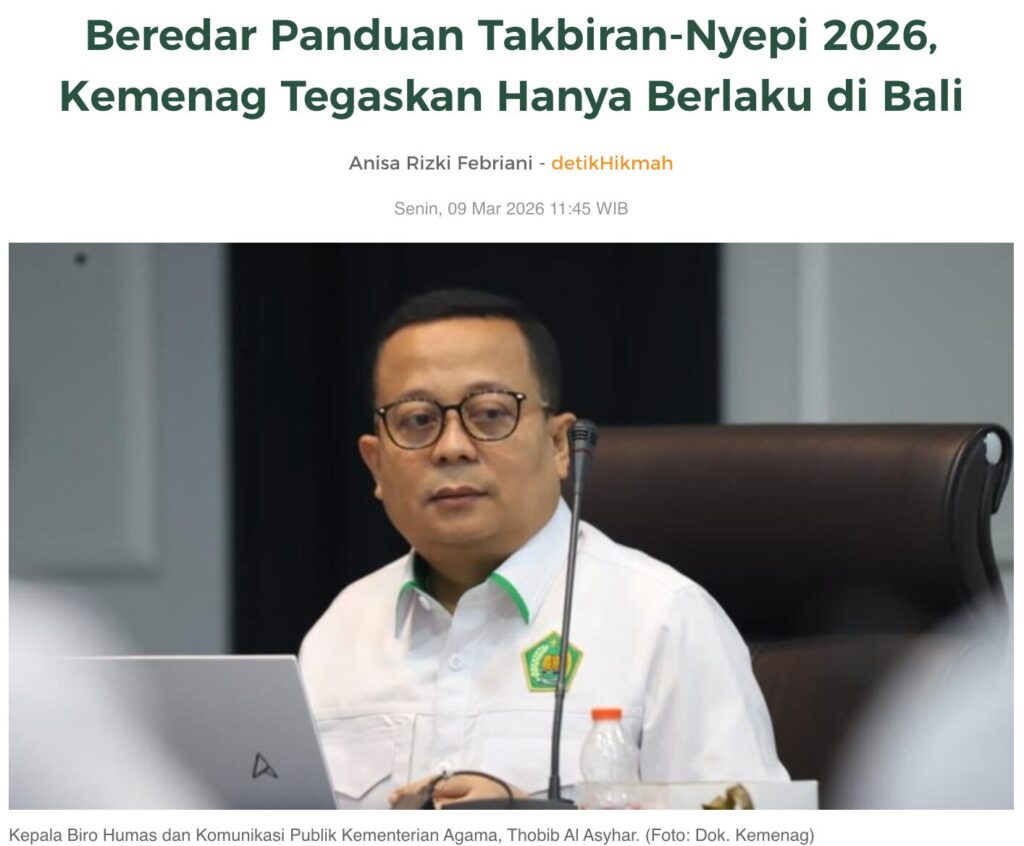 Hasil penelusuran lainnya merujuk pada pemberitaan dari Detik.com (09/03/2026), Kepala Biro Humas dan Komunikasi Publik Kemenag RI, menegaskan bahwa panduan Takbiran-Nyepi 2026 tersebut hanya berlaku di Bali. Aturan ini merupakan hasil kesepakatan bersama antara Kemenag, Pemerintah Daerah, tokoh agama, serta tokoh masyarakat di Bali untuk menjaga kekhusyukan hari raya kedua belah pihak.