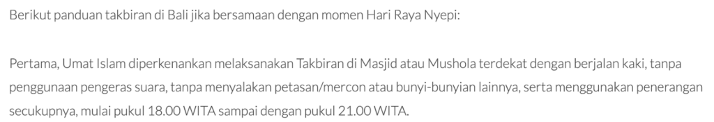 Merujuk pada rilis resmi di laman pta.Kemenag.go.id (08/03/2026), Kemenag menerbitkan panduan khusus bagi umat Islam di Bali. Isinya antara lain: pelaksanaan takbiran dilakukan di Masjid atau Mushola terdekat dengan berjalan kaki, tanpa penggunaan pengeras suara, tanpa menyalakan petasan/mercon atau bunyi-bunyian lainnya, serta menggunakan penerangan secukupnya pada pukul 18.00 hingga 21.00 WITA.