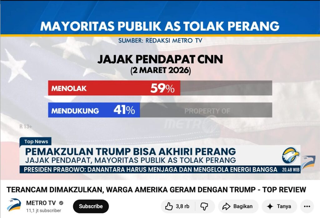 Video yang digunakan dalam unggahan Facebook tersebut diketahui merupakan potongan berita dari kanal YouTube Metro TV (11/03/2026). Isi video aslinya membahas mengenai dinamika kebijakan luar negeri terkait upaya penghentian perang dan hasil jajak pendapat masyarakat AS, bukan mengenai pelengseran presiden.