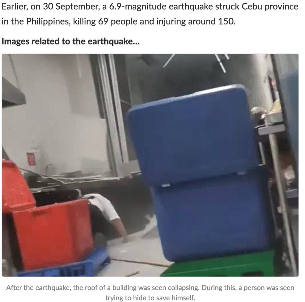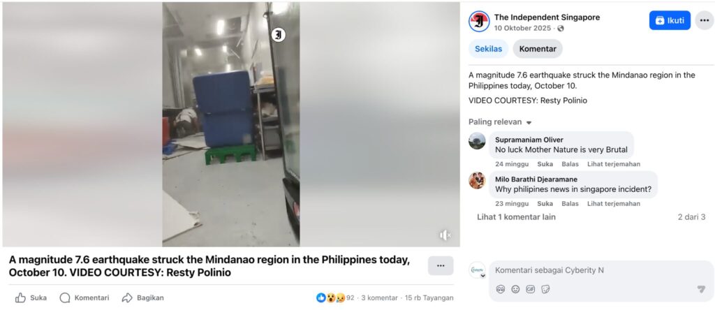 Selain itu, media The Independent Singapore (10/10/2025) juga mengunggah rekaman serupa yang mengonfirmasi bahwa kejadian tersebut berlokasi di Filipina, bukan di Sulawesi. Video aslinya merekam kepanikan warga saat material langit-langit sebuah bangunan runtuh akibat guncangan hebat.