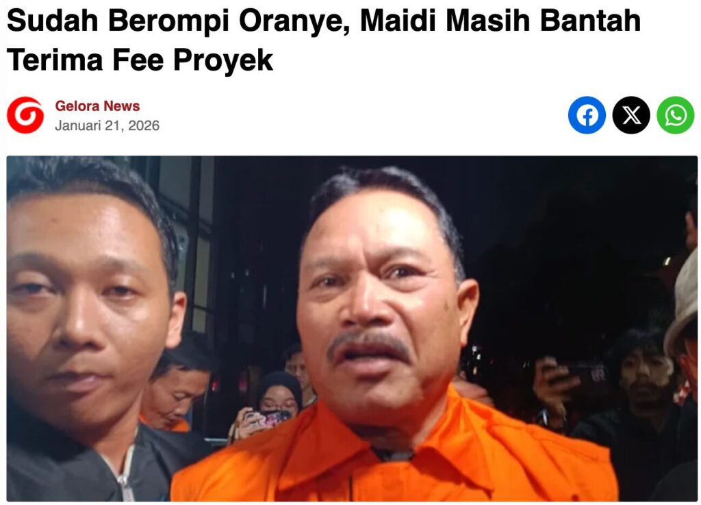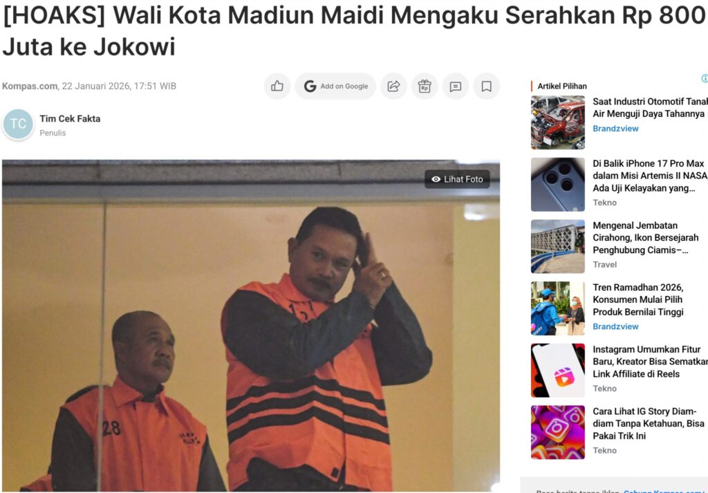 Selain itu, portal berita Kompas.com (22/01/2026) melalui kanal Cek Fakta juga telah mengonfirmasi bahwa narasi serupa adalah hoaks. Faktanya, di laman Gelora News tidak ditemukan informasi Maidi mengaku menyerahkan uang Rp 800 juta. Artikel asli berjudul “Sudah Berompi Oranye, Maidi Masih Bantah Terima Fee Proyek”.